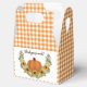 Cajas de regalo rústicas adorables de otoño impresas con un patrón de cuadros naranja y una ilustración de una calabaza pequeña y regordeta con una corona de girasoles y flores de menta verde y amarillas y ramitas de follaje con bayas naranjas. Agradezca a los invitados en su baby shower de otoño, boda de otoño, baby shower de otoño, fiesta de cumpleaños de otoño o cualquier otro evento de otoño con un tema de calabaza con estas hermosas cajas de regalo de calabaza con girasoles y un toque de encanto campestre con el patrón de cuadros impreso.