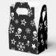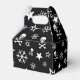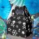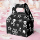 Calavera y huesos cruzados con copos de nieve de bonito y estrellas en un fondo negro.