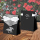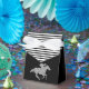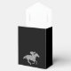 Las cajas de favores de fiesta estilo tienda de campaña con cierre de cinta para despedida de soltera presentan un caballo de carreras con brillo plateado falso sobre negro y rayas blancas y negras en la parte superior. ¡Cambia los colores de fondo a cualquier cosa! Artículos COINCIDENTES en nuestra colección.