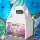 Una pequeña caja de favores con una imagen escénica de un pacífico lago morado. Rodeado de cerezos y cascadas.