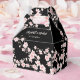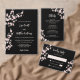Apricot cherry blossom branches on a black background. Bride and Groom names and the wedding date at the front side. At the backside are Thank You words.