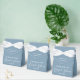 Esta caja de favor de fiesta de despedida de soltera de azul polvoriento presenta tipografía blanca minimalista elegante y debajo un hermoso lazo. Cajas de favores de ducha grises azules simples y dulces para una novia costera.