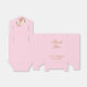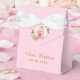 Una caja de favores rosa para el bautizo de una niña. En la solapa, tiene una foto de niña reemplazable en un marco dorado irregular formado por dos hexágonos dorados que se superponen, con una cruz dorada en la parte superior y con orquídeas rosadas y blancas hacia arriba a la derecha y hacia abajo a la izquierda del marco.