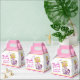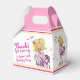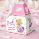 Rosa gráfico brillante con rayas de vieiras y chica de pelo rubio gráfico sosteniendo un conejo blanco afortunado y un regalo, gracias a las cajas de regalo de cumpleaños. Ideal para tus chicas favores de cumpleaños. Personaliza con tu propio nombre y edad de cumpleaños. Actualmente lee Gracias por venir al Noveno cumpleaños de Justine. Arte original y diseño de Sarah Trett.