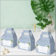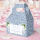 Diseño de caja de favores de boda inteligente con fondo de patrón de clave griega azul marino y blanco, un frasco de jengibre acuarela lleno de flores neutras azules y blancas y hojas verdes, y un panel frontal que contiene el texto personalizado.