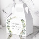 Caja de Favor de Primavera con Acuarela Botánica de Eucalipto Suculenta Verde sobre fondo blanco - incluye tipografía de guión hermosa y elegante con hojas botánicas modernas y vegetación para la celebración especial del día de la Boda.