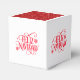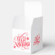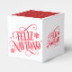 This favor gift box is printed on with Feliz Navidad text alog with two snowflakes in red on each panel of the box on white background. Faux glitter print in red on top,
