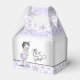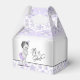 Cajas de favores para baby shower de niñas con una adorable bebé vestida con un traje de pantalón de volantes de lavanda purpura sobre un bonito fondo de encaje gris y purpura. Puedes agregar tu propio texto y mover a los bebés y el texto según sea necesario. También puedes eliminar el texto de 'es una niña'.