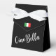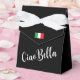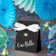 Abraza la esencia de la feminidad con nuestra encantadora caja de favores negra, adornada con un lazo de satén. Esta caja no es solo un símbolo de aprecio; es una celebración del espíritu femenino. El cierre frontal presenta delicadamente una pequeña bandera italiana, mientras que la parte frontal de la caja luce una elegante escritura blanca que dice 'Ciao Bella'.