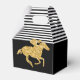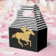 Las cajas de favores de fiesta con forma de frontón presentan un caballo de carreras en purpurina dorada falsa sobre rayas negras y blancas en la parte superior y negro en la parte inferior - ¡cambia los colores de fondo a cualquier cosa! Genial para fiesta de Derby, ducha de novia de Derby, fiesta de cumpleaños, fiesta de jubilación y más. Artículos COINCIDENTES en nuestra tienda.