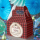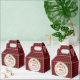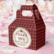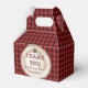 Elegantes cajas de favores con un patrón de trenzado de búfalo rojo y negro y diseño de trozos de árbol.