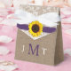 Celebre con estilo con estas elegantes y muy modernas cajas de favores de boda. El diseño presenta un girasol rústico con ramas de buceo, encaje y cinta morada, perfecto para cualquier celebración de matrimonio con temática de campo o granero. El diseño es fácil de personalizar con sus propias iniciales de monograma y su familia y amigos estarán encantados cuando reciban estas fabulosas cajas de favores. Se pueden encontrar elementos coincidentes en la colección.