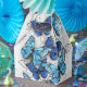 Composición vertical de mariposas morfo realistas, azules y blancas sobre fondo texturado gris. Mariposa morfo azul.