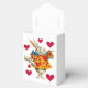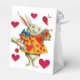 Caja de favores de carpa blanca con cinta blanca con una imagen vintage de Alicia en el País de las Maravillas, en la parte delantera y trasera, del Conejo Blanco en plena regalia en medio de corazones rojos caprichosos. Intente cambiar la cinta a rojo o azul para obtener contraste. Vea la bolsa de favores correspondiente, la etiqueta de favor en forma de corazón, las bolsas de regalo, la etiqueta, el pegatina cuadrado, el pegatina de vinilo cortado por personalizado y el papel de envoltura. Vea toda la colección de la caja de favores de Wonderland en los TOUCHES ESPECIALES | Sección de favoritos de partido.