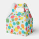 Añade un toque especial a tus favores de cumpleaños. Esta divertida y colorida caja de favores está decorada con puntos de polka en rojo, naranja, amarillo, verde y azul sobre un fondo azul claro. En la parte delantera de la caja hay un lugar para añadir tres de tus fotos favoritas junto con el nombre y edad del niño de cumpleaños.