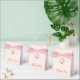 Una caja de favor de color rosa para una boda con colores de boda rosa y rosa dorado. En la solapa, tiene un escudo de armas de color rosa dorado con un monograma. El mensaje Gracias está escrito en la parte inferior, en una elegante escritura rosa dorada, la ocasión y la fecha están escritas en mayúsculas debajo. El fondo es rosa pálido.