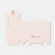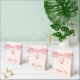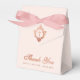 Una caja de favor rosa para el bautizo de una niña. En la solapa, tiene una cresta de oro rosa con una cruz en ella. El mensaje Gracias está escrito en la parte inferior, en una elegante escritura de oro rosa, la ocasión y la fecha están escritas en mayúsculas debajo. El fondo es rosa pálido.