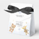 Un niño pequeño está en camino de los niños caja de favores para la ducha de bebé con adorables osos de peluche, estrellas, media luna, cojines de corazón de amor pastel y fondo de color ruidoso. Añada fácilmente sus detalles haciendo clic en el botón "Personalizar" situado arriba