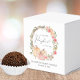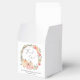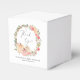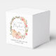 Cajas de favores de fiesta para tu ducha de bebé con "Gracias" y "una calabaza dulce está en camino" en tipografía gris moderna y un guión con un latido cardíaco, y una corona acuarela de calabazas y flores rosa pastel, melocotón y crema.