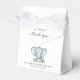 Cajas de regalo para tu ducha de bebé con "un gracias dulce" escrito en una mezcla de tipografía gris suave y un guión elegante con toallitas y una acuarela azul pastel de un elefante bebé. Personalice el nombre y la fecha de ducha de la futura madre en una simple tipografía gris.