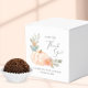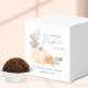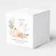 Cuidados cajas de favores neutrales de género para tu ducha de bebé de otoño con "A Sweet Little Gracias" y "A Sweet Little Pumpkin Is On It's Way" escritas en una tipografía gris y un guión elegante con un toque de corazón, y un ramo de acuarela de calabaza naranja pastel, flores y vegetación. Personalice el nombre de la futura madre y la fecha de la ducha en una simple tipografía gris. Puede especificar el género si lo desea, por ejemplo, "está en camino".