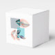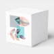 Diseño moderno con cuadrados y hojas que contrastan los colores cian, rojo y naranja.