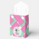 ¡Y se va al altar! La caja de favores de fiesta de estilo carpa con un cierre de cinta blanca presenta a una dama con su sombrero Derby en la parte delantera con su mensaje en un fondo de bloques diagonales de rayas rosadas, verdes y blancas. Divertidas cajas de regalo para ducha de novia o cambia la redacción y úsala para una fiesta de cumpleaños o cualquier ocasión. 3" de ancho x 1,5" de largo x 3,25" de alto. Artículos COINCIDENTES en nuestra tienda.