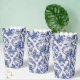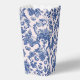 El diseño de esta caja de palomitas de fiesta tiene un diseño grandilocuente precoz con un patrón de damasco azul marino sobre un fondo rosa rubor.