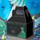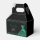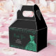 A beautiful Dark Green themed elegant watercolor dress gown on a black background with faux glitter at the top and bottom of the favor box.