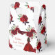 Esta dulce caja de 16 favores incluye flores de flores de flores rojas purpurinas falsas y una hermosa princesa con piel oscura y un vestido elegante. Es perfecto para una dulce fiesta de 16 años.