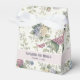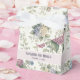 A wedding favor box featuring delicate hydrangea flowers in shades of dusty rose, light purple, and blue.