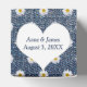 Corazón blanco con nombres recién casados sobre el denim de jean azul y patrón de margarita.
