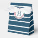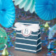 Diseño de temática náutica con decoración monográfica en forma redonda sobre fondo rayado azul y blanco