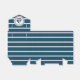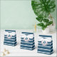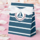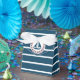 Diseño náutico con decoración de velero en forma redonda sobre fondo de rayas azules y blancas