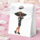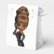 Cajas de favores de fiesta de princesa afroamericana adorable. Puede elegir el color de fondo, agregar o eliminar texto y cambiar el color de la cinta en esta divertida y linda caja de favores de fiesta de mujer afroamericana. El texto debajo de la solapa dice "Gracias, Dahhhhhling!" y se puede eliminar o cambiar.