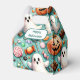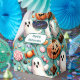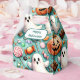 Halloween fantasmas, jack-o-lanterns, murciélagos y dulces sobre un fondo verde azulado.