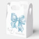 Una caja de favor de fiesta dulce y encantadora que presenta un lazo de acuarela blanco suave colocado prominentemente en la parte superior derecha, creando un aspecto clásico y tradicional perfecto para una ducha de bebé neutral en cuanto al género o tema de ducha de novia como "Ella está atando el nudo" o "Algo azul antes de hacerlo". La esquina inferior izquierda muestra un "¡Gracias!" en negrita en letra manuscrita, mientras que la parte inferior derecha incluye un área pequeña con una tipografía serif clásica donde puedes agregar una nota personal de agradecimiento.
