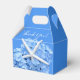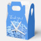 Ducha de novia boda azul o caja de bienvenida con asidero. Flor de hidrangea y diseño de estrellas en azul bonito con texto blanco para decir "gracias" a los invitados en el boda o ducha de novia. La imagen, de temática marina, decora la parte delantera y trasera y contiene una flor de hortensias azul claro con una estrella marina blanca pegada a los pétalos. El texto está escrito a mano en blanco. La caja tendrá que ser doblada después de la compra. Lea más sobre el producto a continuación.