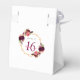 Elegante y glamuroso para una fiesta de cumpleaños 16. En la solapa delantera: letras en burdeos y el texto: Gracias. Delantera y trasera: fondo blanco de moda con un marco geométrico falso dorado. Decorado con flores moradas oscuras y borgoñonas, rosas y plumas de estilo boho. El nombre está escrito con escritura de estilo con letras a mano rosa. La fecha está escrita con números negros y 16 años en burdeos.
