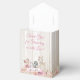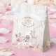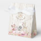 Cajas de favores para fiesta de bebé en el bosque con adorables animales del bosque en un fondo floral y rústico de madera. Estas cajas de favores para fiesta de bebé niña en el bosque se personalizan fácilmente con tu texto.