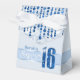 Este elegante bolso de favores Sweet Sixteen presenta un gigante falso purpurina azul "16" y una cinta sobre un fondo satinado adornado con un patrón de joyas colgantes. Agregue el nombre de un celebrante utilizando la plantilla proporcionada. Busque ID260 para ver otros productos con este diseño.