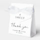 Moderna caja de favores partidarios para tu boda que incluye "Un dulce gracias" en una tipografía simple y un guión de moda, tus nombres unidos por un corazón y tu fecha boda.
