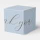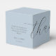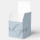 Moda y diseño. Esta caja de favores de boda incluye una fuente contemporánea de guión de brocha gris oscuro en el texto que elija. Elige decir 'Gracias o Bienvenida'. En la parte trasera encontrarás un pequeño mensaje para los clientes, así como nombres de pareja y de boda. La caja de favores está vestida con una bonita y polvorienta chaqueta azul en todos los lados con un interior blanco. Personaliza para que sea tu propio regalo especial.