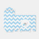 Un diseño adorable y moderno de una ducha de bebé con un patrón de chevron azul y blanco, con una elefante madre y su bebé.