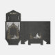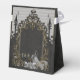 Elegancia en plata y negro. Esta imagen presenta un ilustracion en blanco y negro de un marco boda con intrincados adornos de oro y plata. El marco está decorado con motivos florales ornamentales y una arcada central. Una novia en un vestido de flores, sosteniendo un ramo de flores, se para dentro del marco, mirando lejos del espectador. El fondo es una superficie negra texturada que crea una atmósfera dramática y elegante.