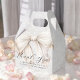 Una caja de favores bellamente femenina con un gran lazo de acuarela de color marfil sobre un sutil fondo de patrón de mármol veteado en marfil y gris. El lazo está inclinado hacia un lado añadiendo un toque de encanto. Se incluye una plantilla de texto para personalizar con su información. Este artículo es una excelente caja de agradecimiento para una despedida de soltera, fiesta de cumpleaños u otro evento simplemente personalizando el texto según sea necesario.