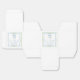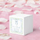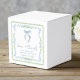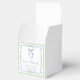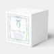 Elegantes cajas de favores de fiesta de desayuno nupcial con marcos de acuarela florales azules y verdes con volantes, un delicado lazo coquette azul de acuarela, "amor + gracias" presentado en una elegante escritura en caligrafía azul, y el nombre de la novia y la fecha del desayuno en tipografía serif clásica.