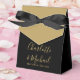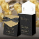 Elegante caja de regalo de boda negra y dorada con nombres en guión con estilo y fecha especial en tipografía moderna. Puedes personalizar con tu propio mensaje de agradecimiento debajo de la tapa. ¡Una forma perfecta de dar las gracias a tus invitados! Diseñado por Thisisnotme©