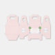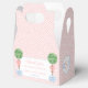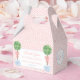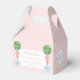 Elegantes cajas de favores con fondo de patrón de clave griega rosa pálido y blanco, las iniciales del bebé en un escudo de monograma y topiario de madera de paja en el panel frontal, junto con el texto personalizado.