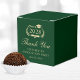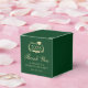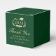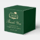 Elegante caja de favores para el partido de graduación verde y dorado que incluye "Clase de" en una corona de laurel con un gorro de grado y diploma, "Gracias" en un guión formal, y el nombre del graduado y fecha fiesta en tipografía clásica.